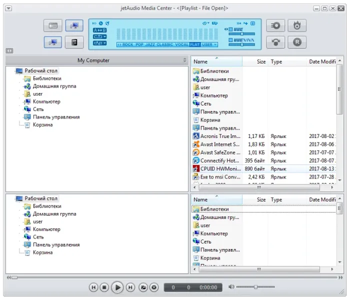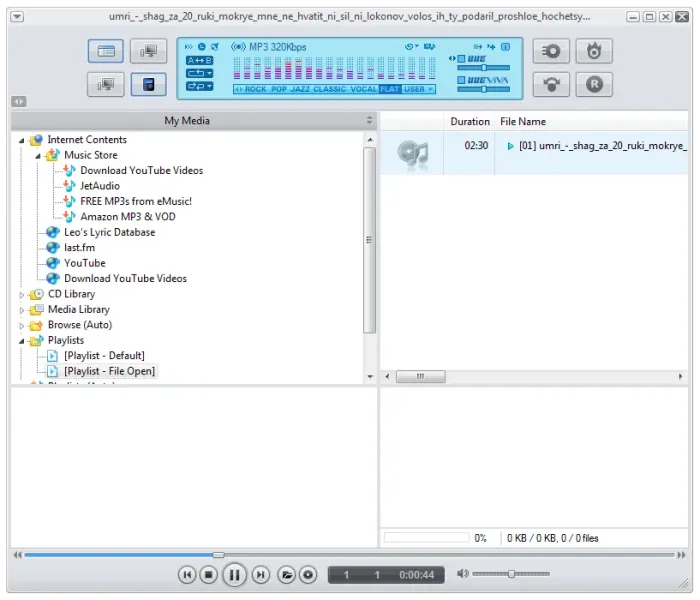JetAudio — это универсальный проигрыватель музыкальных и видео файлов, риппер, конвертер и т.д., в общем, все в одном комплекте. Программа поддерживает практически все музыкальный форматы, умеет проигрывать MP3, MP2, WAV, MID, REAL AUDIO/VIDEO, S3M, MOD, MPG, AVI, MOV, Video/Audio CD, RealPlayer G2 и некоторые другие форматы мультимедийных файлов.Позволяет записывать аудио компакт-диски или копировать их содержимое на жесткий диск ПК. Есть возможность накладывать на композиции различные эффекты, поддерживается синхронизация для караоке, имеется эквалайзер, конвертер форматов, редактор тэгов, кроссфейдинг, субтитры и т. д.